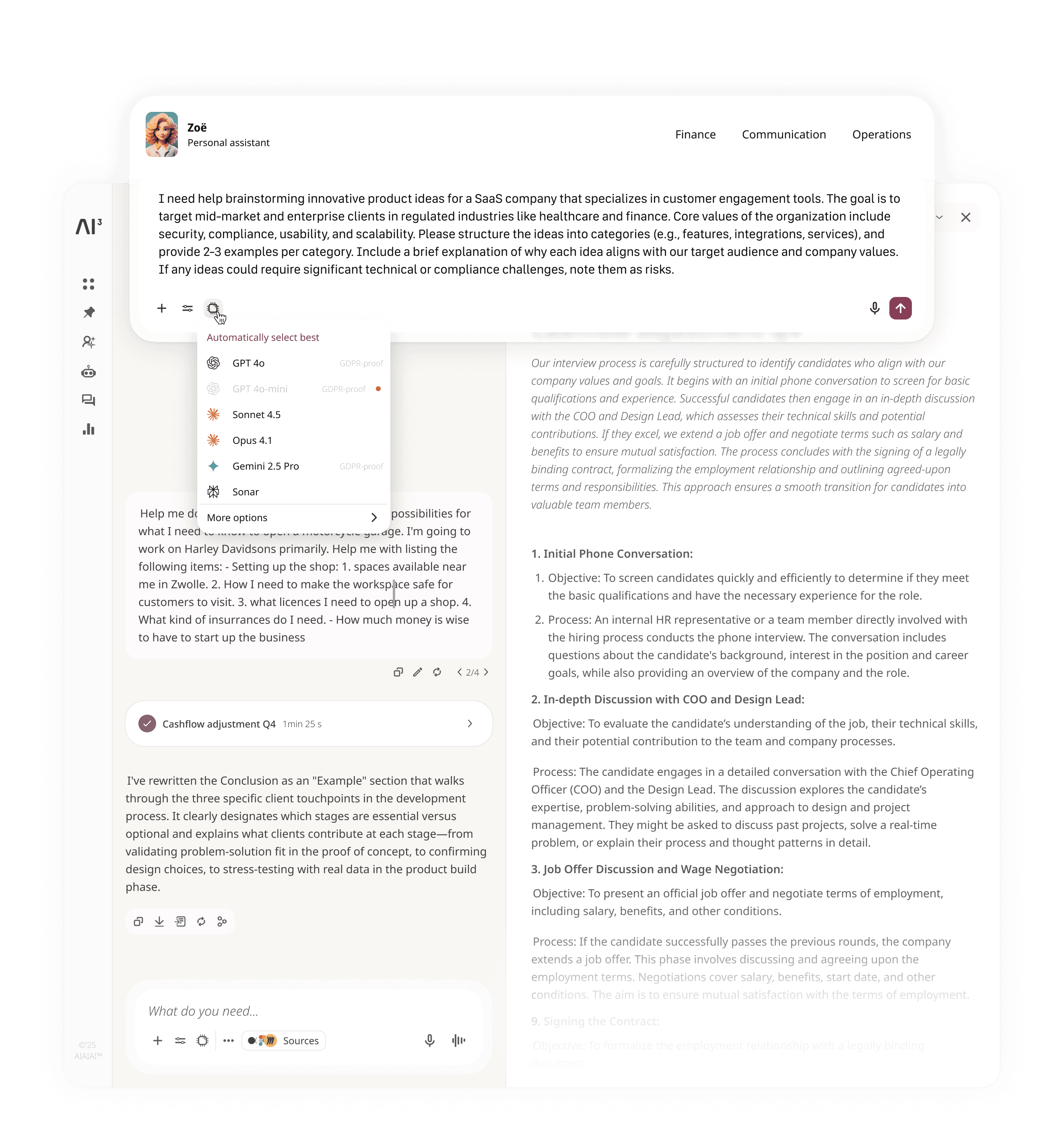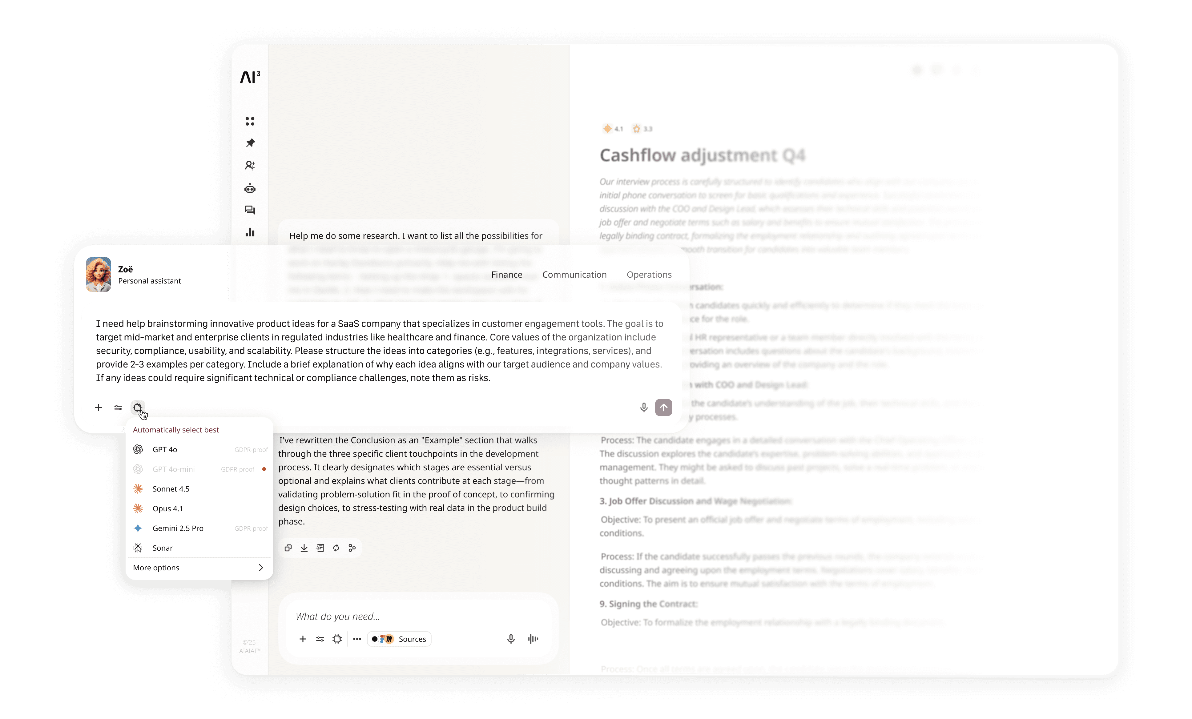 Es gibt Hunderte von LLMs. Die meisten Unternehmen stellen ihren Mitarbeitern eines zur Verfügung. AIAIAI ermöglicht die Nutzung aller gängigen LLMs in einem Konto. Dies erlaubt den Mitarbeitern, das passende LLM für jede Aufgabe zu wählen, und schützt Unternehmen vor IP-Lecks durch private Schattenkonten.